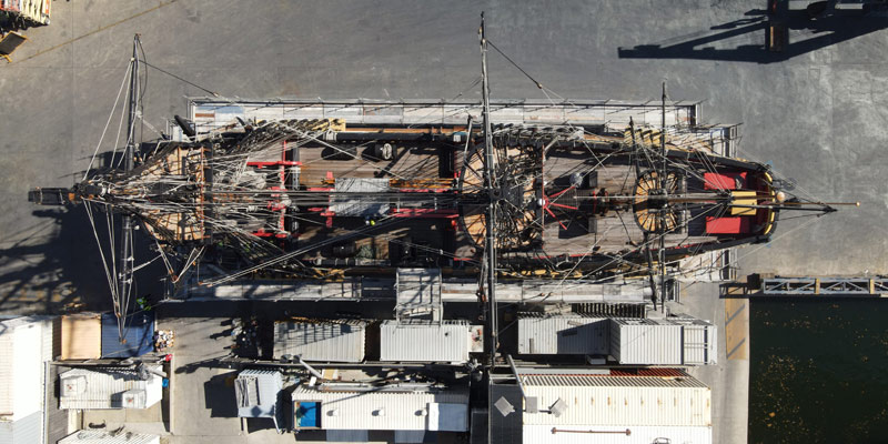 This month Stronghold Hire was asked to help with the restoration of the famous ship that Captain James Cook landed in Australia on – the HMB Endeavour! Ok, maybe not quite the actual ship, but the replica that is stored at the Australian Maritime Museum. The vessel was built in 1988 and has circumnavigated around Australia THREE times and sailed to many overseas ports including Europe and America. More information can be found out on this wonderful vessel here.