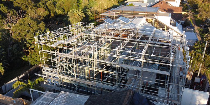 The scaffold wasn’t a straightforward perimeter scaffold with a temporary roof structure. We had to suspend legs for sections that are single storey and the framing was not in yet, which meant that we had to find alternative anchor points. To top it off, we only had around 800mm on either side to install the scaffold.