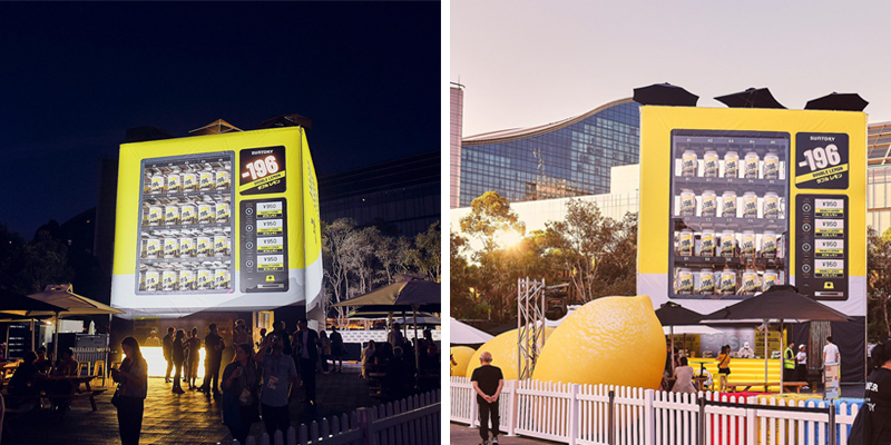 Suntory sought to make a splash at SXSW Sydney with an eye-catching promotion for their new drink -196. Their vision? A mammoth three-story vending machine, strategically placed in Tumbalong Park at the bustling heart of Darling Harbour. Not just a static display, this vending machine was an interactive marvel complete with a scaffold and staging structure, draped in a vibrant fabric print. The crowning feature was a sun deck complete with a rooftop bar and DJ booth, offering panoramic views of the city centre.