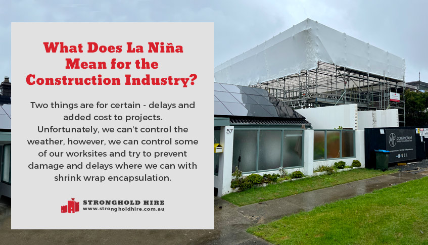 As you may have already read, Australia is in for another wet Summer this year. They are forecasting a third consecutive La Nina event. The experts are branding it “this century’s first triple-dip La Nina!”. So, what does this mean for the construction industry? Well, two things are for certain – delays and added cost to projects. Unfortunately, we can’t control the weather, however, we can control some of our worksites and try to prevent damage and delays where we can with shrink wrap encapsulation.